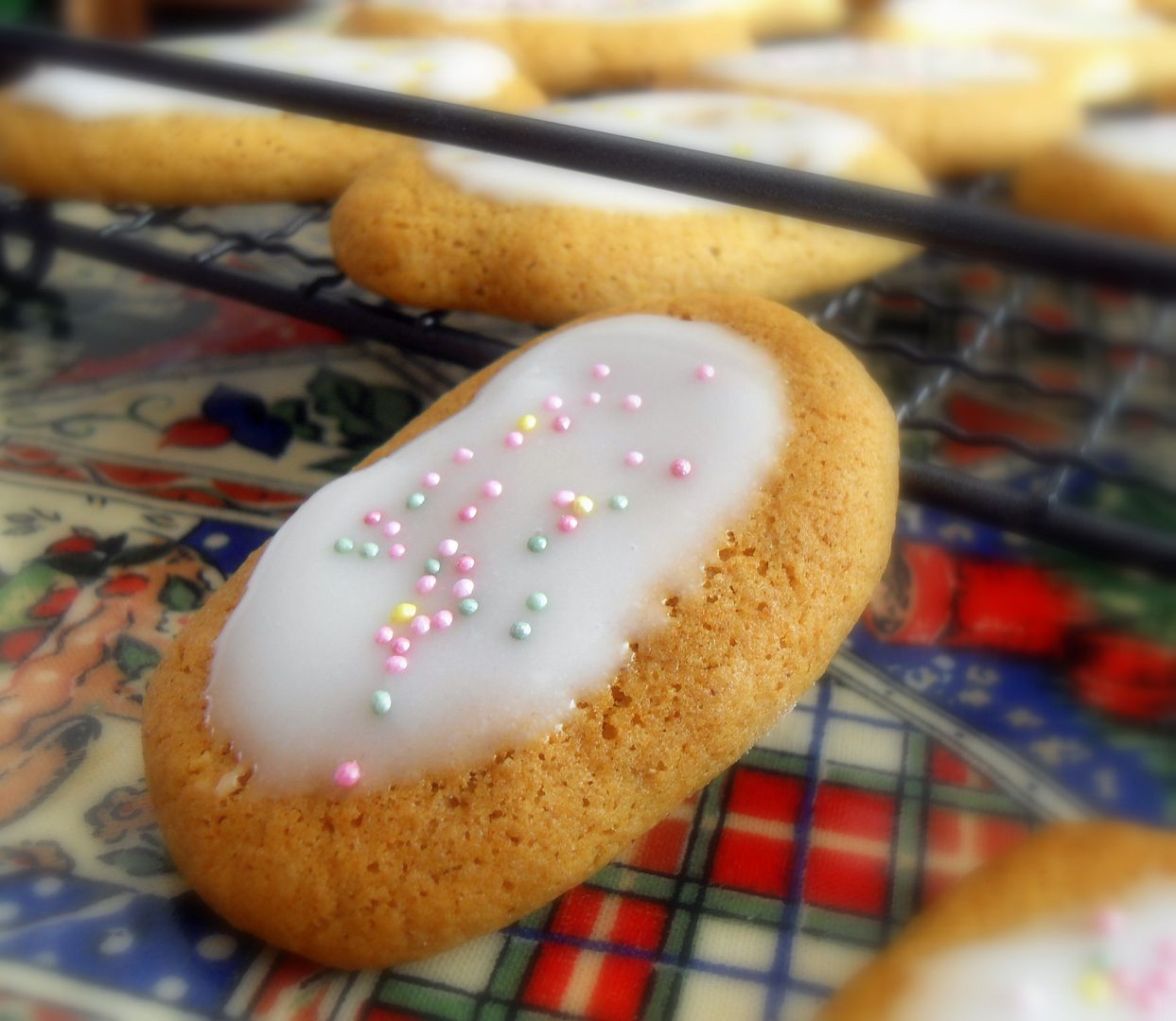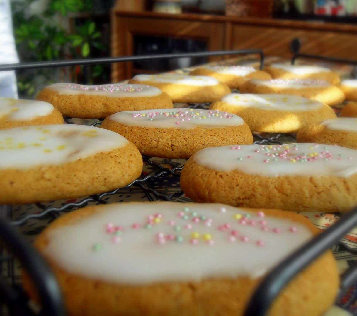 For the icing whisk together the lemon juice and icing sugar to make a thin spreadable icing. Spread over the cookies with a spoon, sprinkling decorations on each one right away. Let set before eating and storing. Store in an airtight container.